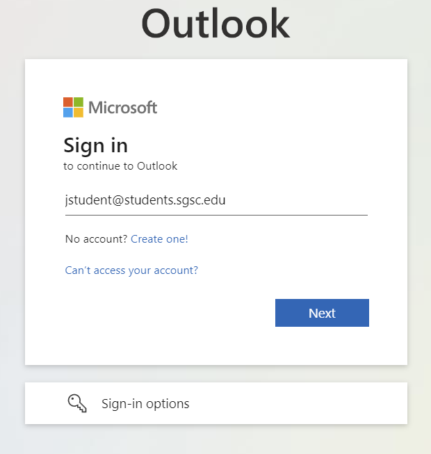 Enter your full SGSC email address in the sign in box then click Next. If you do not know your student email address, click here and use the Student Information Lookup tool.