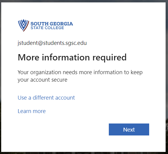 The next screen will say "More information required". This is to set up your password reset and your multifactor authentication. MFA (multi factor authentication) is required for all students and staff. You may use a cell phone to receive a call or text message, or the Microsoft Authenticator smartphone app. If you do not have a cell phone, please contact the IT department for assistance. There are other options available.