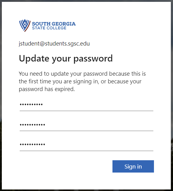 If you entered the correct email address it will take you to the password screen and show the South Georgia State College logo. If you do not see the SGSC logo, go back and make sure you entered the correct email address. In the password box, enter the temporary password as described in the first part of this page: