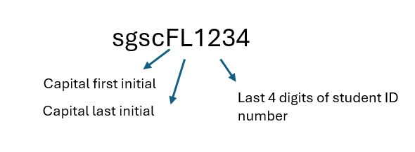 When your SGSC account is created, you are issued a temporary password. The password is made up of the letters sgsc, your uppercase first and last initials, then the last four digits of your Student ID number. If you don't know your ID number you can look it up here.