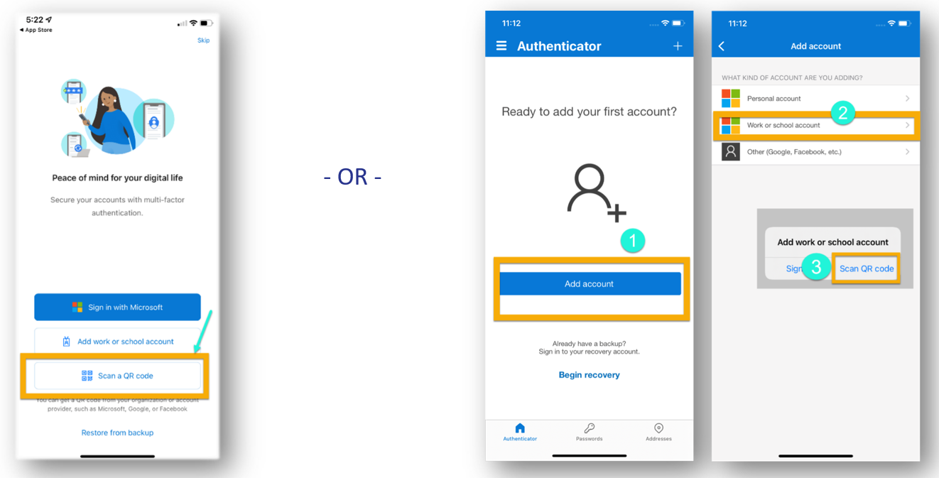 On your cell phone, in the Microsoft Authenticator app, choose the option to add a new Work or School account, and choose the option to scan a QR code.
